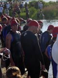 Swim - 1.2m We wade in. Get ready. The water was very comfortable and calm on the protected beach. We walk out farther and farther. The water is - well, black. And we continue to walk out to what seems like half way to the first buoy. I take full advantage by getting up front in the pack, no reason to swim what you can walk. Then we get a "You have 45 seconds, oh wait, you have 10 seconds, my math was never really that good! GO!" That's when all the serenity of the morning disappeared. Flailing arms and kicks churning up the water. The pack was so wide that the biggest issue was getting people from the left and people from the right trying to squeeze in closer as they drew their lines out to the first buoy. Meanwhile I was just pushing ahead thinking we'll be more than spread apart by the time we have to turn around at what seemed like a pinpoint on the horizon. The swim out was with the wind - or rather with the waves, for the most part. It grew to be more from the side the farther we got out into the main body of water. And then we turned into the chop. Head on. It got nasty. Taking in *some* water was inevitable but it got to a point that I wondered exactly how much could I take in without being seriously sick when I got out. It was just about every stroke some water would splash in. At times full mouths of water with no air. Switching sides didn't help any as the chop was mixed but relatively head on. And sighting was difficult to impossible. With a yellow marker on the horizon I did my best to shoot right at it. Unfortunately the buoys weren't the only yellow things out on the water- kayakers also had yellow vests (on the outside of the course) so I added some distance to an already tough course. But that wasn't all- the jelly fish (or sea nettles) were out in force. I don't know what the differences are between them but you don't need to know when you're getting stung. One thing is certain, getting one in the face would not be good. I got a few stings on my arms but was spared from the face plant. Overall it was a slow and tedious effort. The disappointment of
